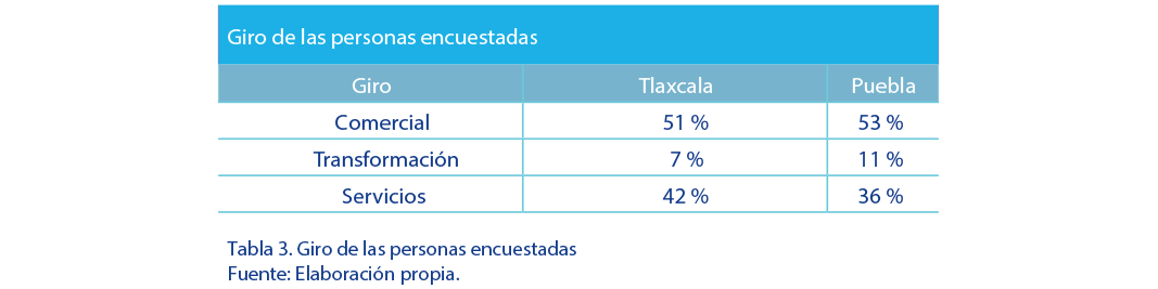 De acuerdo con los resultados obtenidos, en Tlaxcala el 51% de los encuestados pertenece a las empresas de tipo comercial y en Puebla un 53 %, lo cual representa que este giro es el de mayor importancia. La ubicación estratégica de ambos municipios en el centro del país permite establecer canales de comercialización de manera estratégica hacia toda la República Mexicana. |