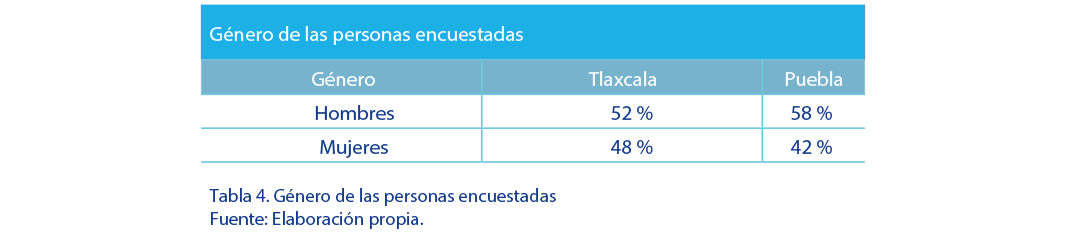 Tanto en Puebla como en Tlaxcala, los resultados indican que más de la mitad de las personas encuestadas resultaron ser hombres, con un 52 % y un 58 % respectivamente. Sin embargo, la participación de la mujer en el ámbito empresarial cada vez cobra mayor fuerza, a pesar de los estereotipos que la sociedad establece para este género. |
