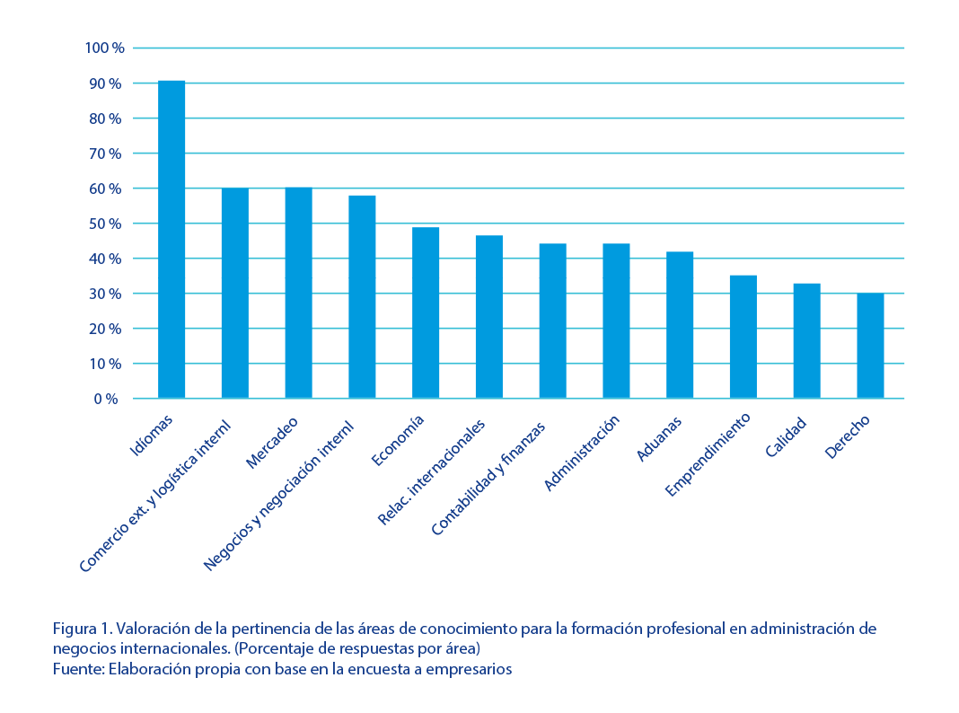 En cuanto al manejo de software especializado, sobresale el manejo de sistemas de información gerenciales para la planificación de recursos empresariales (ERP por sus siglas en inglés y SAP Systeme Anwendungen und Produkte en alemán) en los procesos productivos y de distribución. También se hizo mención del Customer Relationship Management (CRM por sus siglas en inglés), que se utiliza para incrementar las ventas a la clientela actual y potencial, por medio del análisis de los datos históricos de la interacción entre cliente y empresa. Entre las herramientas generales, se hizo referencia al manejo de Office y de Internet. El idioma inglés fue mencionado como requisito en 12 de los 16 puestos. En términos de las áreas de conocimiento, 5 de las temáticas (idiomas, comercio exterior y logística internacional, mercadeo, negocios y negociación internacional y economía) obtuvieron 50 % o más de respuestas positivas con respecto a la pertinencia de su formación para una persona especializada en la administración de NNII (Figura 1). Emprendimiento, calidad y derecho fueron las temáticas con menor porcentaje de respuesta en relación con la pertinencia de su formación. Áreas de conocimiento en relaciones internacionales, contabilidad y finanzas, administración y aduanas se mantuvieron por debajo del 50 % de las respuestas, pero en un porcentaje cercano a él. |