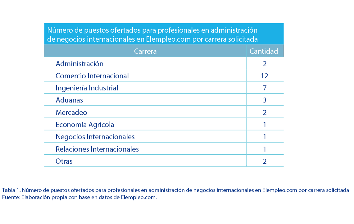 Colet, Balgiu & Zaleschi (2017) reconocen que en la era de la Industria 4.0 los profesionales deberán contar con habilidades blandas específicas que requieren necesariamente una revaloración de los programas de desarrollo profesional y capacitación. Para ello, es importante plantear estrategias educativas que promuevan juegos de roles y coaching, entre otros, que favorezcan el desarrollo de competencias orientadas hacia la flexibilidad, asertividad, independencia y disciplina, con el fin de que el profesional pueda responder de manera ágil y rápida a los cambios (Benesova & Tupa, 2017; Colet, Balgiu & Zaleschi, 2017; Pernías, 2017). Galindo, Ruiz & Ruiz (2017) agregan la importancia de que la inmersión en la era digital debe fomentarse y desarrollarse más allá del uso de herramientas simples, orientando la formación hacia el aprovechamiento de aquellas que permitan la generación de conocimientos y contenido. Siendo así, la formación de profesionales debe contar necesariamente con conocimientos basados tecnologías disruptivas, análisis de Big Data, inteligencia artificial, tecnologías 3D y tecnología en la nube, entre otras (Betz, 2016; Fitsilis, Tsoutsa & Gerogiannis, 2018; Hecklau, Galeitzke, Flachs & Kohl, 2016; Lee, Kao & Yang, 2014). En el área de conocimiento de las ciencias económicas, se valoran aquellas relacionadas con liderazgo, compromiso ético y honestidad, compromiso con la calidad, capacidad de trabajo en equipo y capacidad de aprender y actualizarse (CINDE, 2018; García, 2009; Gutiérrez, Kikut, Rodríguez, Navarro, Picado y Azofeifa, 2016; Milhauser & Rahschulte, 2010; Puga & Martínez, 2008; van Heugten, Heijne-Penninga, Robbe, Jaarsma & Wolfensberger, 2017). En virtud de lo anterior, es de importancia para las universidades formar profesionales integrales, lo cual conlleve a la comprensión, análisis y sensibilidad hacia aspectos relacionados con la manera en que la cultura, el idioma, los sistemas políticos, la geografía y los factores socioeconómicos globales afectan la forma de hacer negocios. Requerimientos de formación para profesionales en el campo de la administración de empresas internacionales en Costa Rica A continuación, se sintetizan los resultados de los análisis de la base de datos de Elempleo.com, la encuesta a empresarios y las entrevistas a personas expertas. De la encuesta se obtuvieron 42 respuestas de empresarios, gerentes y, en general, personal de la alta dirección de las empresas consultadas. Es preciso subrayar que la encuesta tenía la posibilidad de contestarse de manera anónima. Además, no todas las personas contestaron la totalidad de las preguntas. La mayoría de las empresas a la que pertenecían fueron del sector comercio y servicios (25 de las 31 que respondieron), cuatro de ellas son del sector agrícola y 2 del industrial. La revisión del sitio Elempleo.com permitió analizar 16 empleos considerados por las autoras como aquellos aplicables a personas graduadas de las carreras de negocios internacionales. De ellos, seis correspondían a empresas del sector servicios, cuatro a manufactura y los demás uno en cada uno de comercio al por menor, consumo masivo, educación, industria alimentaria, salud y tecnología. La mayoría de los puestos solicitados correspondían al área de compras de la empresa (6), seguida por las áreas de comercio (5), mercado internacional (4) y distribución (1). Estos puestos generalmente son para niveles profesionales (10 de los 16), aunque se solicitaban tres para coordinador(a) y tres para niveles de dirección superior (gerente, director, jefatura). Además, 7 de los puestos solicitan el nivel de bachillerato y 9 el de licenciatura. Entre las profesiones requeridas, sobresalen las de administración, comercio internacional e ingeniería industrial (ver tabla 1). |
