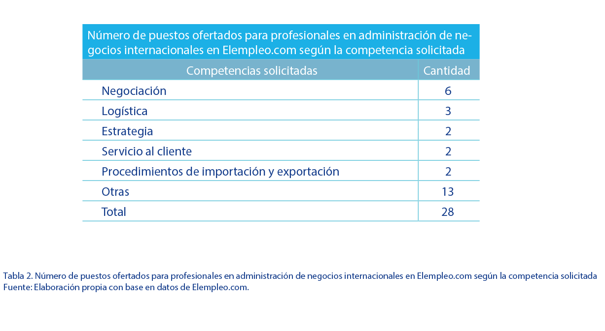 En relación con las competencias, 6 de los puestos solicitaron competencias en negociación, la más frecuente, seguida por los temas de logística, estrategia, servicio al cliente y procedimientos de exportación e importación. Otras mencionadas son calidad, capacidad analítica, compras, control interno, evaluación, gerencia, liderazgo, manejo de personal, marketing digital, mercados internacionales, normativa, políticas y ventas (ver tabla 2). |