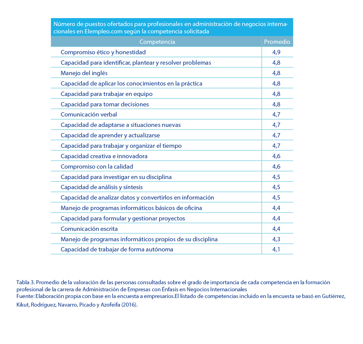 En el marco de tecnologías y programas informáticos, según las personas encuestadas, los programas básicos como el Office son fundamentales, sus 22 menciones superan por mucho los demás; pero, se señaló el manejo de Excel avanzado particularmente como una herramienta necesaria en los NNII. Otros programas importantes son los especializados, como los sistemas de información gerenciales para la planificación de recursos empresariales (ERP), entre los cuales se encuentra el SAP. En el caso del software TICA, para procesos de importación y exportación, se indicó la necesidad de acceso a prácticas en los cursos se la carrera. Las redes sociales, en cuanto a su uso para impactar los negocios y el mercadeo, también se consideraron de importancia. Entre los programas de comunicación, se mencionaron aquellos de mensajería y conferencias, tales como Skype, Facetime, Whasapp, Telegram, etc. En el cuestionario se consultó la importancia de un listado de competencias para una persona profesional de la carrera de Administración de Empresas con Énfasis en Negocios Internacionales. Para cada una de ellas, se solicitó la valoración con una escala de 1 a 5, donde 1 correspondía a la importancia más baja y 5 a la más alta. La pregunta fue contestada por 32 personas. La totalidad de las competencias consultadas recibió una alta valoración: todas mayores a 4. Como se observa en la tabla 8, las que se consideraron de mayor importancia son las de compromiso ético y honestidad (4,9), capacidad para identificar, plantear y resolver problemas (4,8), manejo del inglés (4,8), capacidad de aplicar los conocimientos en la práctica (4,8), capacidad para trabajar en equipo (4,8) y capacidad para tomar decisiones (4,8). Este resultado se complementa con lo mencionado en las entrevistas a personas expertas con respecto a la necesidad de que las personas graduadas demuestren tener habilidades blandas: “Las habilidades blandas deben incorporarse al currículo, se deben enseñar, evaluar; pero, sobre todo, que se pueda demostrar que el estudiante las ha adquirido para que esto le sirva en su vida laboral (Salazar, D., comunicación personal, 20 de setiembre del 2018). En esa misma entrevista se señalan como básicas las siguientes: