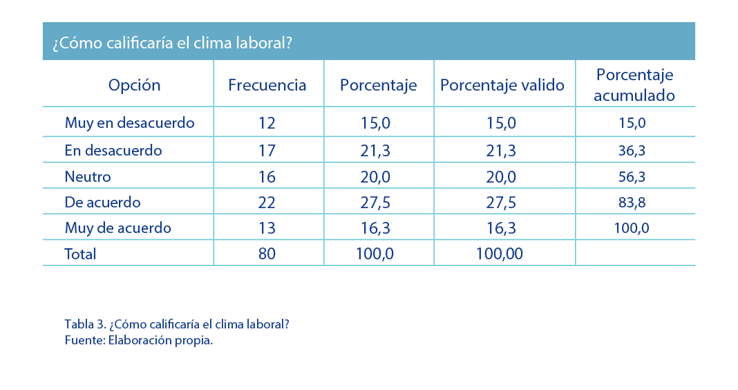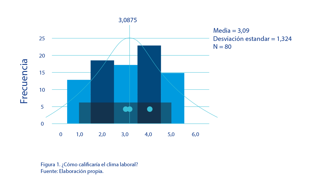 En cuarto lugar, se interrogó a la población seleccionada acerca de la calificación de los actuales procesos administrativos. Los resultados no denotan un cambio radical en las respuestas previas, a pesar de que debe señalarse la categoría 2 como la más repetida, es decir, que sobresale una opinión desfavorable en relación con la ejecución de estos procesos. A su vez, los participantes asignan un promedio un poco inferior (2,988) a los interrogantes anteriores, con una desviación de 1,14186 unidades de la escala asignada. A partir de lo anterior, se recomienda a la alta dirección de la empresa estudiada que efectúe una revisión de los procesos administrativos. Ello debe ir de la mano con la aplicación de un diagnóstico de mayor profundidad en cuanto a las percepciones de estos procesos, aclarando cuáles ajustes deben efectuarse en ellos. La quinta pregunta efectuada buscaba conocer la calificación relacionada con la aplicación de la normativa vigente. En este sentido, se podría calificar de favorable la respuesta, ya que el parámetro de mayor repetición fue 5. También se da continuidad a los resultados previos en relación con la mediana y que denotan una percepción dividida en relación con la gestión de la organización. Así mismo, se desvían del promedio (3,050) un total de 1,4574 unidades. Las respuestas a esta pregunta permiten inferir que la organización pudo tener mala publicidad en cuanto al cumplimiento de las leyes, aspecto que es de suma gravedad, ya que refleja falencias en la acción gerencial, así como en la aplicación del actual sistema de gestión. Igualmente, tal como en respuestas anteriores, se observa la existencia de heterogeneidad en los resultados, a partir de la presentación de datos ubicados entre 1 y 5, es decir, muy de acuerdo y muy en desacuerdo. En sexto lugar, se preguntó a los encuestados acerca de la calificación del servicio. En este caso, se manifiesta una valoración desfavorable, ya que, a pesar de repetir con mayor frecuenta el valor 3, los participantes se ubican en promedio en una opinión desfavorable (2,925). También se registró un desvío en promedio de 1,3759 unidades de la escala y el 20 % de los encuestados presentó una opinión muy desfavorable en cuanto al servicio prestado. La calidad del servicio se consolida como uno de los pilares en la satisfacción de las necesidades de los clientes. Por ende, la evaluación de los resultados enunciados, a pesar de que evidencia valores promedios y coherentes con las respuestas anteriores, muestra que la organización debe realizar mayores esfuerzos de capacitación a sus colaboradores para que a futuro ello no se traduzca en reducciones del segmento de mercado al que va dirigida la empresa. La séptima pregunta se dirigió a la valoración en cuanto al clima laboral en la organización. La variable de mayor repetición fue favorable (4); además, se presenta un valor de la mediana equivalente a las respuestas previas. Del valor promedio (3,088), se desvían 1,3235 unidades y tan solo el 15 % de los encuestados manifiestan una posición desfavorable en cuanto al clima laboral. |