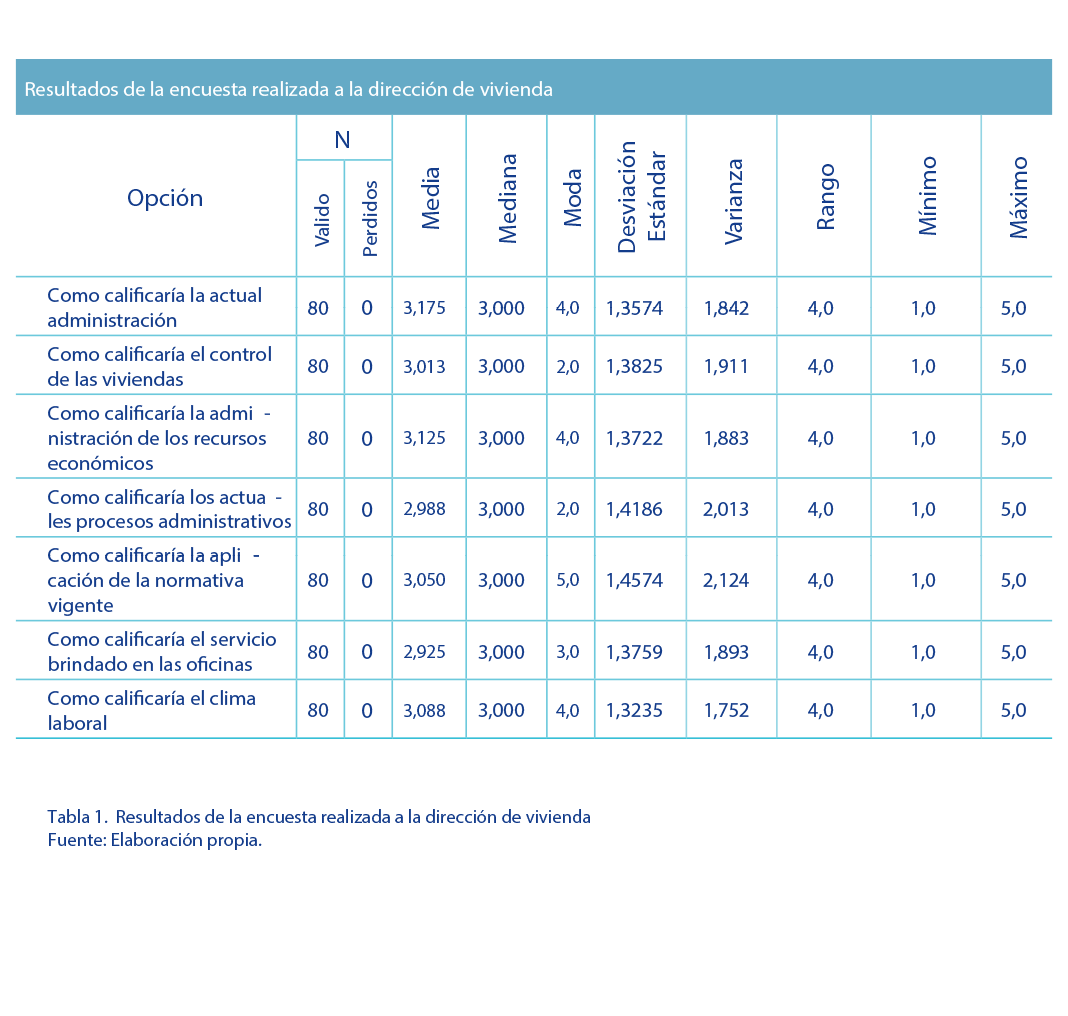 La primera pregunta de la investigación se circunscribió a la interpretación acerca de la gestión actual desarrollada en la empresa. El resultado obtenido, tal como se visualiza en la figura 3, es que un bajo porcentaje de tan solo el 35 % tiene una percepción negativa. Ello coincide con el hecho de que 50 % del personal otorga una calificación superior a 3,0, lo cual significa que el valor promedio en el que los participantes se ubican es 3,175. Además, los participantes que se desvían de dicho valor representan 1,3574 unidades de la escala. La existencia de una amplia distribución entre los valores 1 y 5, es decir, muy en desacuerdo y muy de acuerdo, evidencia la necesidad de que los administradores de esta organización desarrollen prácticas en las cuales obtengan mayor realimentación de los diversos actores sociales y, de esta manera, mejorar las prácticas de gestión en la empresa. En segundo lugar, se preguntó acerca de la calificación que se asigna al control de las viviendas. Ello evidenció que la variable de mayor repetición fue 2, es decir, una calificación desfavorable. Los resultados denotan que la mayoría de la población prefiere asumir una posición neutral en relación con lo preguntado; en otras palabras, el 50 % se encuentra se ubica por encima del valor 3,0 y la cifra restante debajo de este valor. Igualmente, en relación con el valor promedio en que se sitúan los participantes (3,013), se desvían 1,3825 unidades de la escala; ello significa una cifra semejante a la pregunta anterior. Cabe destacar que las respuestas obtenidas en relación con el control de las viviendas denotan que no existe homogeneidad en las posiciones acerca de ellas, lo cual apunta a debilidades en el proceso. En este tópico en particular, la aplicación de estrategias orientadas a mejorar este control es de carácter urgente, lo cual puede ir de la mano con el desarrollo del sistema de gestión propuesto. La tercera pregunta se enfocó en calificar la administración de los recursos económicos de la organización objeto de estudio. Ello corresponde con las respuestas anteriores, donde las opiniones se encuentran divididas, a pesar de que la variable de mayor repetición fue 4. Por otro lado, los participantes continúan ubicándose en el valor neutral de 3,125 y solo el 34 % asigna una calificación desfavorable. Igualmente, se evidencia en los resultados que existe heterogeneidad en las respuestas otorgadas por parte de los encuestados. Sin duda alguna, esta situación pone de manifiesto la existencia de ciertas dificultades en el proceso de gestión de los recursos y denota fallas en el proceso de planeación de la empresa. |