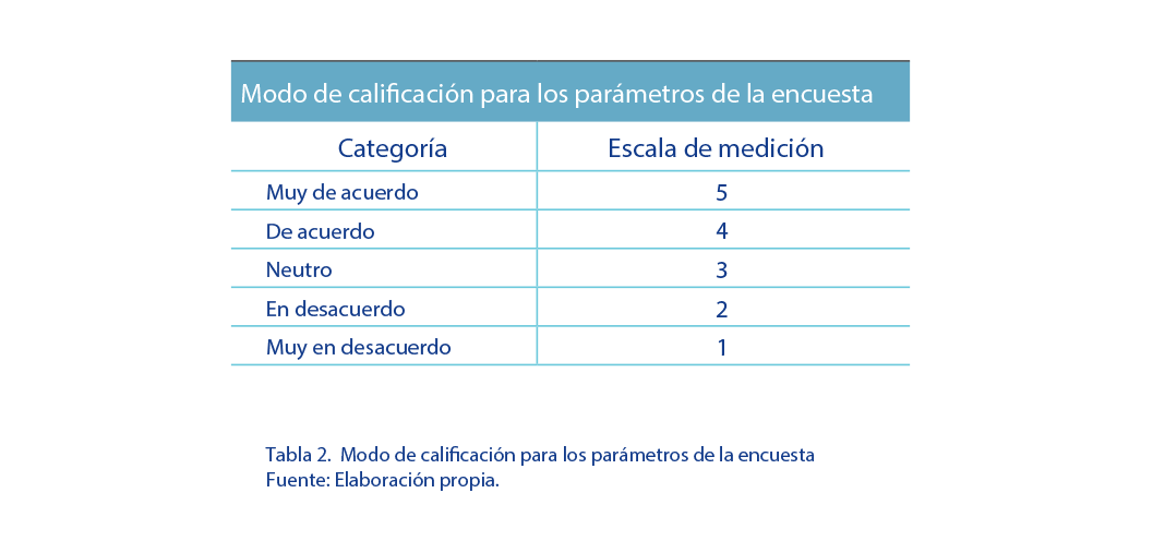 Posteriormente, con los resultados obtenidos en las siete preguntas planteadas a la muestra, se procedió a la presentación de cada uno de éstos en forma detallada, para luego extraer las respectivas conclusiones. Cabe mencionar, que la metodología de calificación de los parámetros en el instrumento aplicado se describe a profundidad en la Tabla 2. |