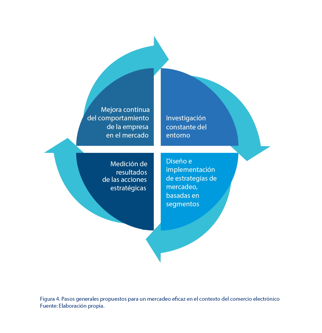 En este sentido, es relevante el aprovechamiento de las tecnologías presentes y la adaptación constante a tecnologías disruptivas que generen oportunidades de negocio para el comercio electrónico. Este tipo de usos puede beneficiar la interacción entre las empresas y los consumidores, mejorando su experiencia, por ejemplo, a través de mecanismos de respuesta inmediata con el uso de inteligencia artificial como los chatbots de marketing, que brindan mensajes instantáneos ante consultas de los clientes; o bien, aprovechar las tecnologías para hacer inteligencia de mercado y tomar mejores decisiones de marketing. Además, es importante para la empresa reconocer los segmentos de mercado que desea atender y enfocar su cliente objetivo o mercado meta para poder definir acciones estratégicas delimitadas. Por otra parte, tomando en cuenta la fuerza del marketing digital que Fischer y Espejo (2017) definen como “todas las estrategias mercadológicas llevadas a cabo a través de los medios digitales u online” (pág. 233), se consideran puntualmente algunas acciones estratégicas para promover el comercio electrónico, entre ellas las siguientes:
