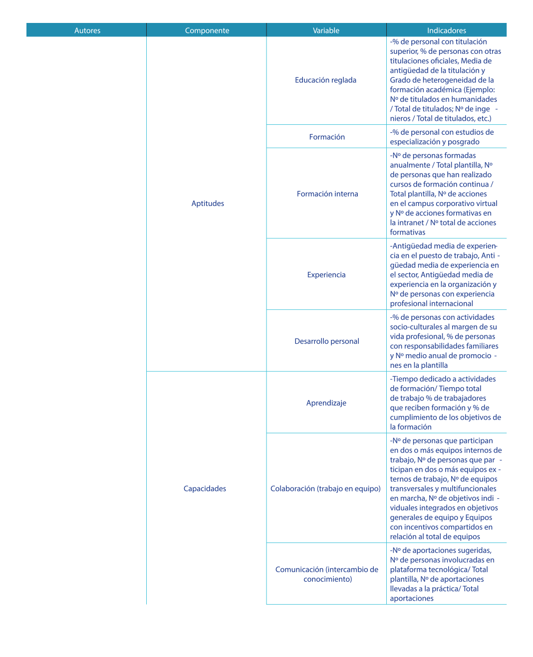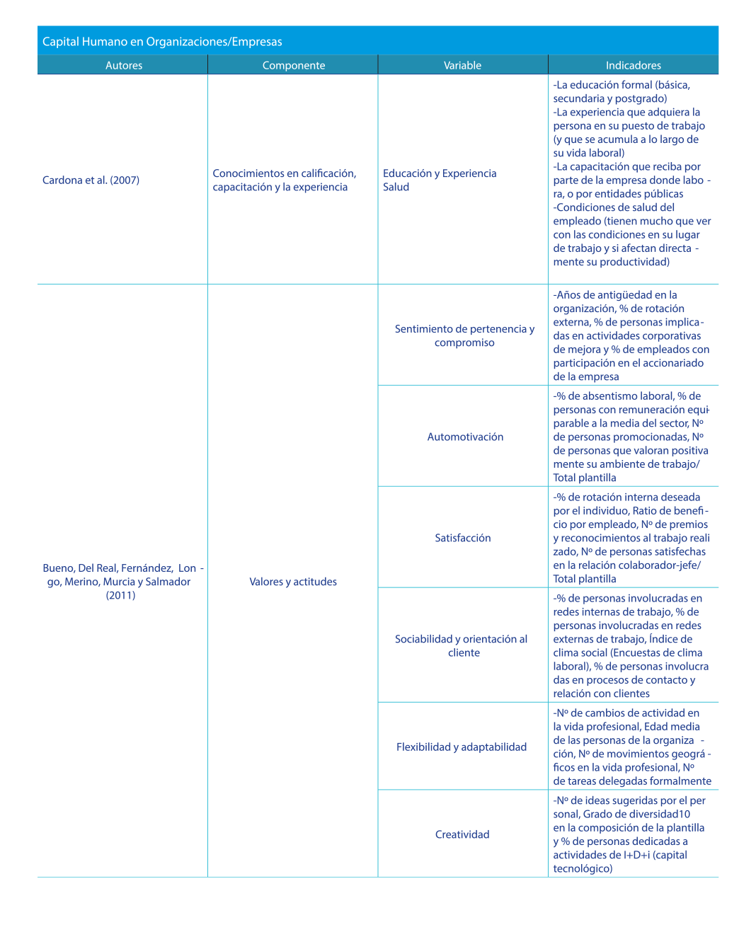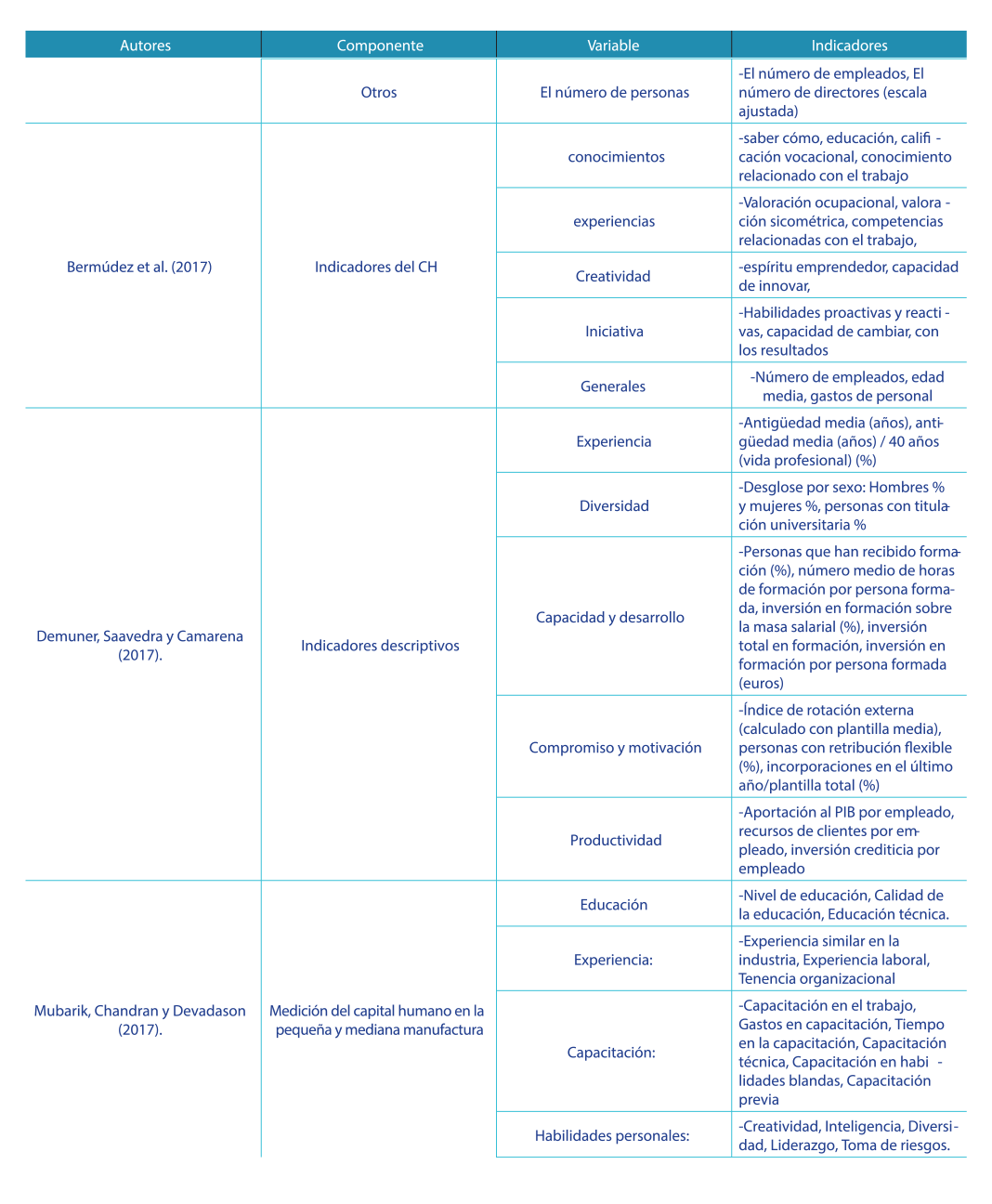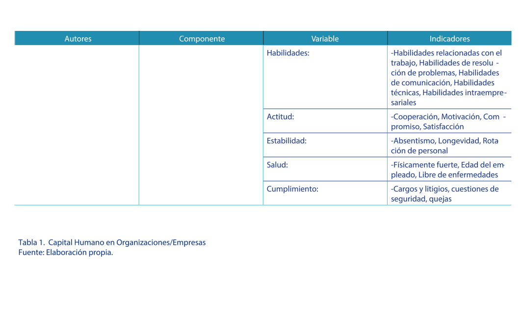 De los indicadores presentados se rescata entre los más representativos a nivel empresarial componentes para su medición tales como la educación, salud, experiencia, capacitación, capacidades, habilidades, conocimientos, actitudes y saberes en general de los individuos. |