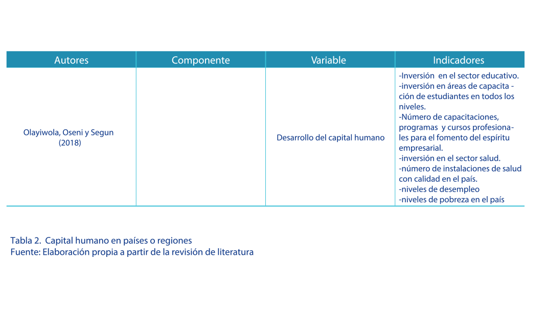 De la misma forma, Villarreal (2016) llevó a cabo un estudio con el propósito de exponer las externalidades del capital humano en México, basándose primeramente en la literatura sobre el tema y datos duros, esto debido a que según estas externalidades son factores clave para el crecimiento económico de las ciudades, regiones y países, argumentando además que la teoría del capital humano demuestra que entre mayor sea el nivel educativo de la población, esto traerá consigo efectos positivos en el ámbito económico, social y político. METODOLOGÍA Para el desarrollo de la presente investigación se utilizó el método de revisión de literatura de investigaciones, que de acuerdo con Fink (2014) dicho método contribuye a la evaluación y síntesis de trabajos de investigación, y plantea además que al analizar estos estudios pasados sobre un tema de interés, como lo es en este caso los componentes del capital humano, es posible aportar información y datos relevantes que puedan suponer una base para futuras investigaciones. Por lo que para llevar a cabo este estudio se optó por realizar una revisión profunda de artículos de investigación científica de las diferentes bases de datos a las que se tuvo acceso, tales como Redalyc, ScieELO, Dialnet, EBSCO, Emerald, Elsevier, JSTOR y Wiley, analizando y recopilando la información más relevante para el desarrollo de este trabajo, con el fin de proponer como principal aporte los componentes e indicadores del CH más representativos. RESULTADOS Y DISCUSIÓN Como se planteó en un inicio, se lograron identificar dos vertientes estudiadas en torno a los indicadores de CH. La primera de ellas aborda los indicadores a nivel organización o empresa, mientras que la segunda vertiente se relaciona con indicadores a nivel País o región. A continuación se presentan los principales indicadores encontrados al interior de las organizaciones (ver tabla 1) y regiones o países (ver tabla 2), dichas tablas contienen el autor, componente, variable y finalmente los rubros medibles para el desarrollo del CH. |