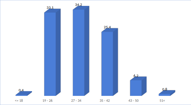 As for the age of the respondents: 34.2% are from 27 to 34 years old, 33.1% are from 19 to 26 years old, 25.4% are 35 to 42 years of age (see figure 1).