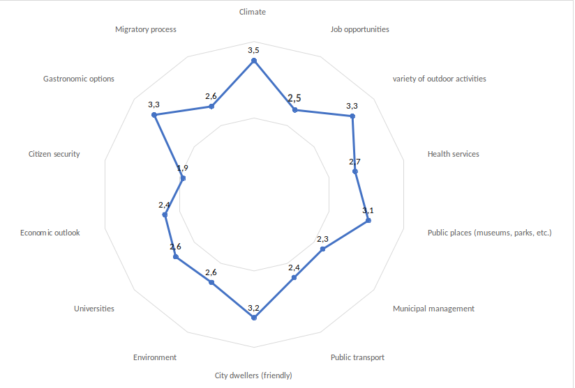 Regarding the opinion of the characteristics of the city of Tijuana (see figure 2). On a scale of 1 to 5, with 1 being terrible and 5 excellent (see figure 1), climate got a score of 3.5, gastronomic options 3.3, variety of outdoor activities 3.3, public places such as museums and parks 3.1, and the friendliness of the city inhabitants 3.2.