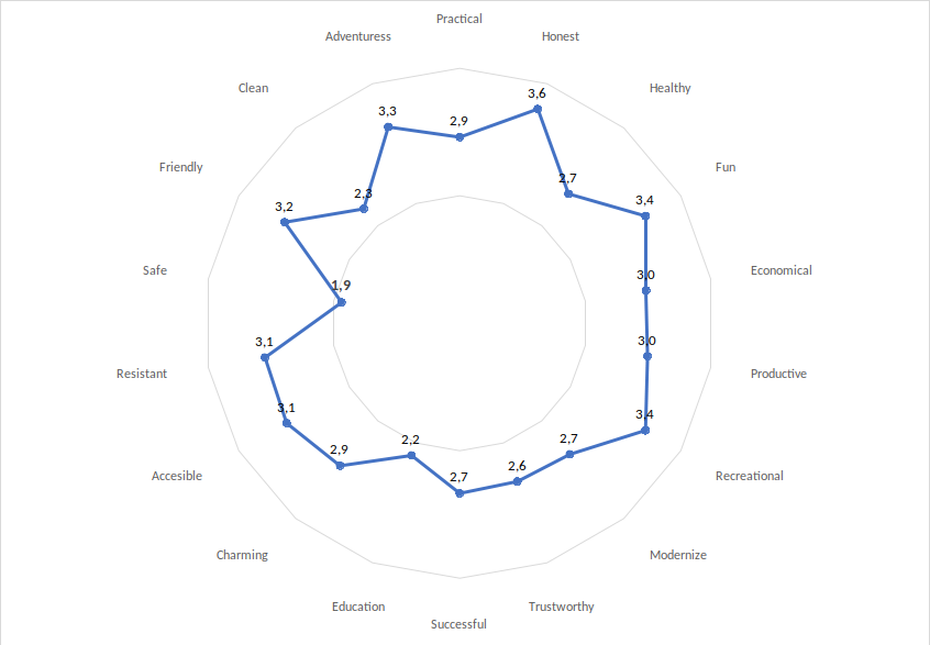 In figure 3, the personality of the city of Tijuana is shown. On a scale from 1 (terrible) to 5 (excellent), the inhabitants of Fort Irwin considered the border city honest, fun, recreational, friendly, accessible, resistant, economical, and productive.
