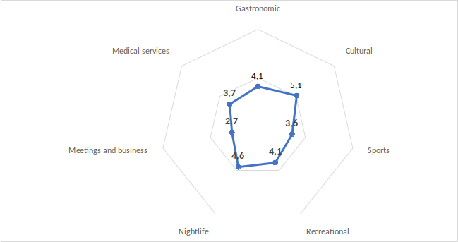 Regarding the evaluation of the services offered by Tijuana on a scale from 1 to 7, with 1 being the lowest score and 7 being the highest score, Fort Irwin residents evaluated cultural services with a score of 5.1, followed by nightlife 4.6, recreational and gastronomic services with the same score 4.1, medical services 3.7, sports 3.6, and meetings and businesses (2.7) (see figure 4).