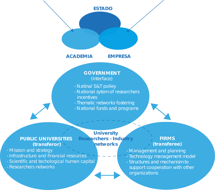 Se utiliza en esta investigación el modelo de la triple hélice como base para interrelacionar esferas interinstitucionales que integran la transferencia tecnológica y, por consiguiente, impulsan el desarrollo tecnológico y económico basado en el conocimiento. Para propósitos de nuestro estudio se concibe la Triple Hélice como la interacción tríadica entre el Estado (E), la Academia (A) y la Industria (I) Etzkowitz (2000). Para la adecuada colaboración entre estas tres organizaciones, la idea de hélices denota que se trasciende la cooperación simple para dar lugar a relaciones interactivas dentro del contexto de la transferencia tecnológica que pueden llevar al intercambio puntual de roles. La universidad incursiona en actividades empresariales con sus instalaciones de incubación; la industria educa a través de universidades empresariales; mientras que el gobierno se convierte en un capitalista de riesgo a partir de su inversión en I+D e impulsa a los otros sectores a resolver cuestiones de competitividad nacional. Es a partir del modelo de triple hélice que se promueve la misión emprendedora de la universidad, siendo ésta la base fundamental entre las relaciones gobierno- industria- academia.