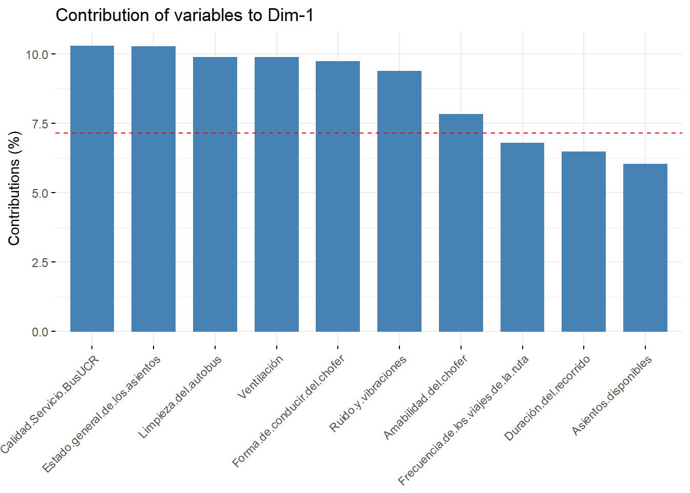 Para este ejercicio, se utilizaron las respuestas relacionadas con el servicio de autobuses externos de la Universidad de Costa Rica, conocido como BusUCR, que brindaron los usuarios del servicio. En este aspecto en particular se utilizaron 531 respuestas completas, las cuales le dieron al servicio una calificación general de 6,96 en promedio. Para cada aspecto se le pidió a la persona usuaria que lo calificara del 0 al 10.