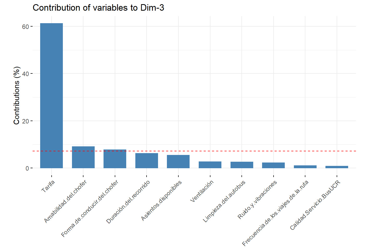 The analysis of the main components allows to generate a reduction of the dimensions of the problems with a minimum loss of information. In this particular case, a reduction is achieved from 14 original dimensions to 3 dimensions for the case of the student transport service of the University of Costa Rica and to 4 dimensions for the regular public transport service. The identification of these dimensions of the perception of the quality of public transport services from the user’s perspective could be used as an input to prioritize interventions and improvements in the services provided.