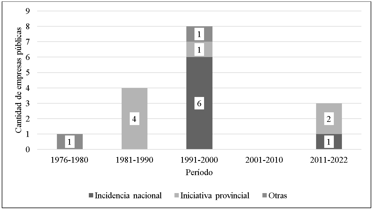 La clasificación expuesta supone la jerarquización del factor principal que influyó en el origen de las empresas públicas existentes en la actualidad, sin que esto implique desconocer otros factores intervinientes. Así, se definen como: a) de incidencia nacional el origen de las entidades que se derivan de políticas de descentralización desde el nivel central, o de cambios en los marcos normativos nacionales que se materializan en la transferencia de funciones hacia las unidades federativas; b) de iniciativa provincial, cuando existen centralmente razones de gestión o la instrumentalización de políticas mediante una empresa pública de parte de la administración provincial; y c) otros factores, cuando la incidencia de cuestiones o trayectorias particulares no permite atribuirles las categorías precedentes de manera unívoca.
