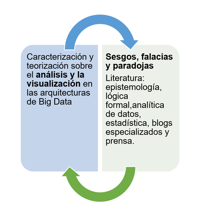Se presentan acá los conceptos relacionados a diferentes posturas teóricas que fundamentan la investigación. Así, se profundiza, especialmente, en el concepto de Big data y sus arquitecturas, como también en los sesgos, las falacias y las paradojas. Entonces, a nivel metodológico, se tiene en cuenta lo expuesto en el apartado anterior, es decir, el marco teórico que permite comparar los conceptos de visualización y análisis con los diferentes errores identificados, es decir, los relaciona y, por tanto, los justifica.